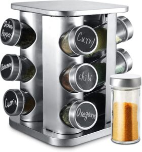 Los especieros giratorios son una solución ingeniosa que te permite acceder fácilmente a tus especias. Estos especieros suelen ser circulares y se apoyan sobre una base giratoria. Esto significa que puedes darle un giro y encontrar la especia que necesitas en segundos. Son ideales para cocinas donde el espacio en la encimera es limitado, ya que aprovechan al máximo la verticalidad.